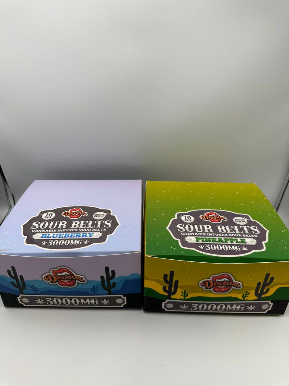 Devour Sour Belts 3000mg are THC-infused gummy edibles designed in the form of sour candy belts. Each package delivers a massive 3000mg of THC, making it one of the most potent edible options on the market.